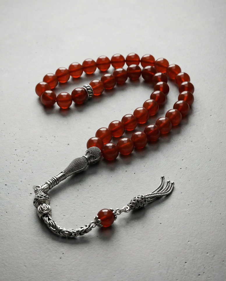 Akik, mikrokristalin kuvars yapısı ve doğal damar oluşumlarıyla bilinen, tesbih dünyasının en köklü ve en çok tercih edilen taşlarından biridir. Bu modelde kullanılan 8 mm küre kesim akik taneleri, taşın doğal renk tonlarını ve yüzey desenlerini güçlü bir şekilde yansıtır. İmame, püskül ve ara durakların tamamında kullanılan 925 ayar gümüş, ürüne hem değer hem de modern bir zarafet kazandırır.