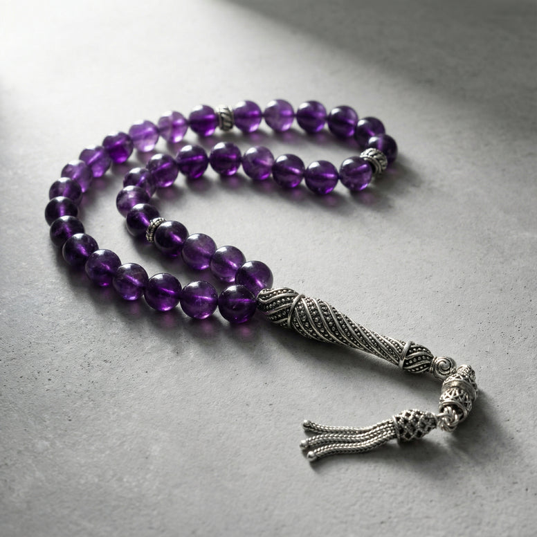 Ametist, menekşe ve mor tonlarının doğal berraklığıyla tanınan kuvars ailesinin değerli bir üyesidir. Bu tesbihde kullanılan 8 mm küre kesim ametist taneleri, taşın doğal mor derinliğini ve ışıkla değişen ton oyunlarını güçlü bir şekilde yansıtır. Modelde imame, püskül ve ara durakların tamamı 925 ayar gümüş olup ametistin rengiyle mükemmel bir uyum içinde premium bir görünüm sunar.