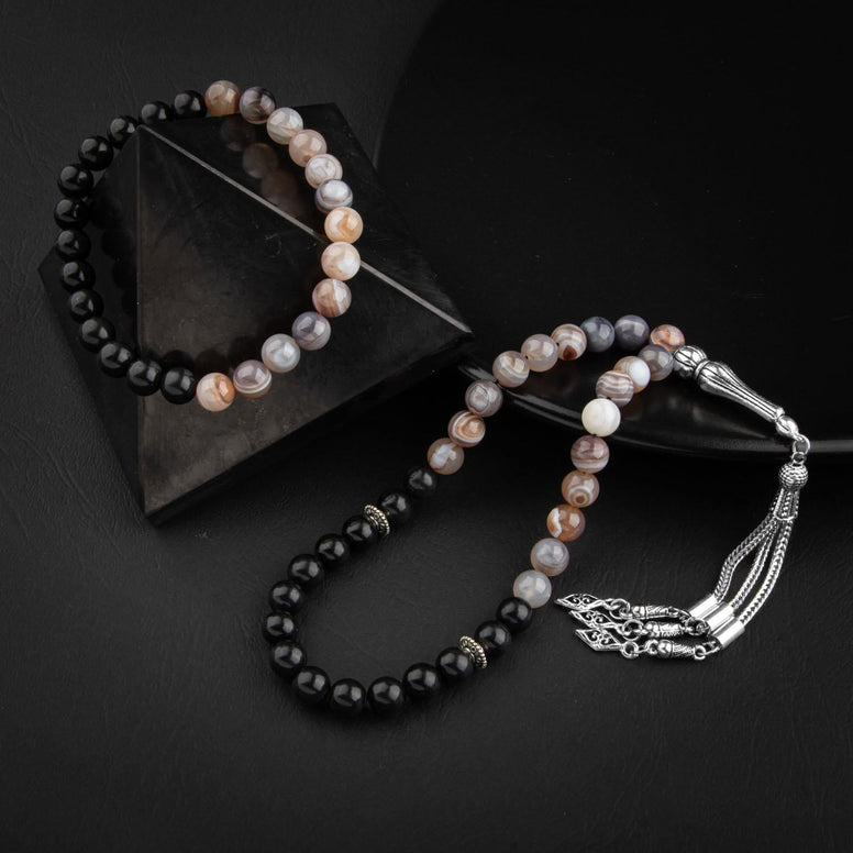 Botswana Akiği & Obsidyen Doğal Taş Tesbih & Bileklik Seti