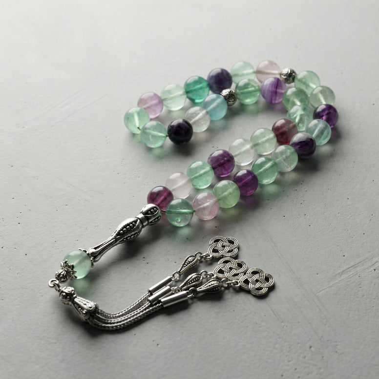 Florit, mor, yeşil ve mavi tonların doğal geçişleriyle tanınan estetik ve koleksiyonluk bir mineraldir. Bu tesbihde kullanılan 10 mm büyük küre taneler, floritin doğal berraklığını ve ışıkla değişen renk oyunlarını güçlü bir şekilde yansıtır. Büyük taneli yapısı sayesinde elde daha tok, gösterişli ve premium bir duruş sunar.