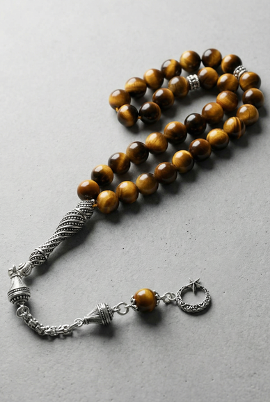 Kaplan gözü, lifsi kuvars yapısı ve ışıkla değişen “kedi gözü efekti” ile bilinen özel bir mineraldir. Bu tesbihde kullanılan 8 mm küre taneler, taşın altın kahve tonlarını ve ışık hareketiyle ortaya çıkan canlı yansımalarını güçlü bir şekilde yansıtır. Modelde imame, püskül ve ara durakların tamamı 925 ayar gümüş olup taşın doğal tonlarıyla mükemmel bir uyum sağlar.