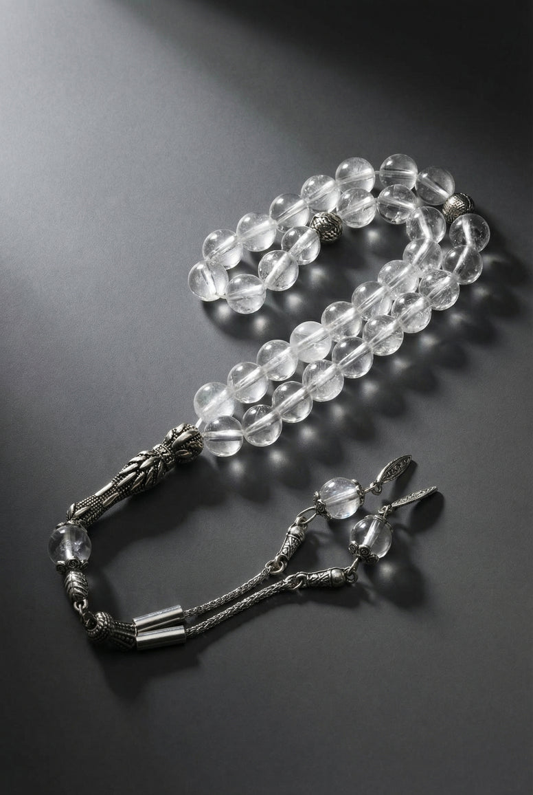 Kristal kuvars, yüksek berraklığı ve ışık geçirgenliğiyle bilinen en değerli kuvars türlerinden biridir. Bu tesbihte kullanılan 8 mm küre kesim taneler, kristalin doğal parlaklığını net şekilde yansıtır. Şeffaf yapısı, sade ve modern bir görünüm sunarken gümüş oksit kaplama detaylarla birleşerek premium bir duruş oluşturur.