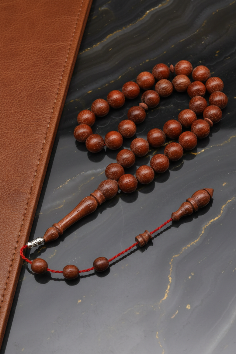Kan ağacı, yoğun ve sert yapısı sayesinde elde tok ve dengeli bir hissiyat sunar. İstanbul kesim formu, ritmik çekim sırasında parmakların doğal hareketiyle uyumlu bir akış sağlar. Ahşabın doğal sıcak dokusu, kullanım sırasında parmakları yormayan ergonomik bir tutuş oluşturabilir. Renkteki doğal kızıl tonlar ve damar yapıları, her tesbihi benzersiz kılar; bu da görsel olarak sıcak ve organik bir algı oluşturur. Bu özellikler, ağacın doğallığından ve ustalıkla yapılan işçiliğinden kaynaklanan kullanım deneyimi potansiyelleridir.